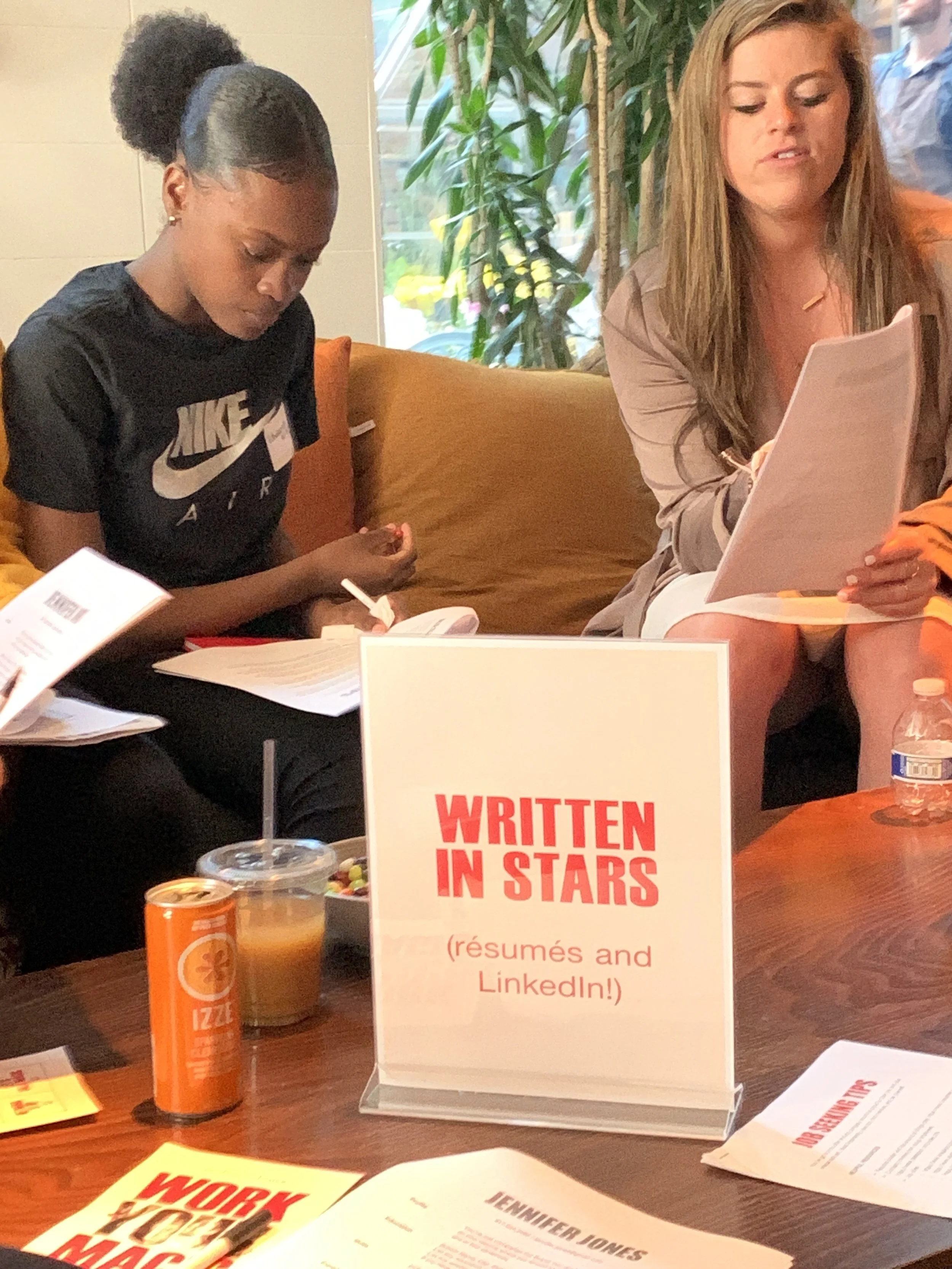 A volunteer from Ellevest runs the Written In Stars resume writing workshop with a group of Day of Empowerment attendees.